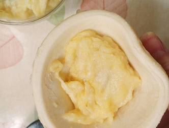 3、用勺子去適量榴蓮果肉放入蛋撻皮中間,然後將蛋撻皮對折