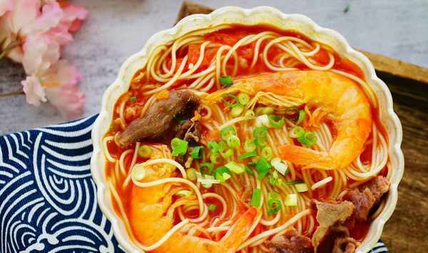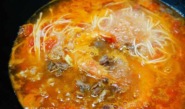 1、這道面的精華其實並不是牛肉,也不是大蝦,而是西紅柿的湯底,用這個湯底不管是煮掛面還是煮方便面都特別好吃。