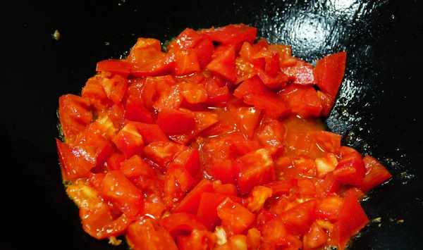 第三步:西紅柿去皮後切丁,加入鍋中大火翻炒,加入半勺糖,半勺陳醋提味,炒成糊狀。