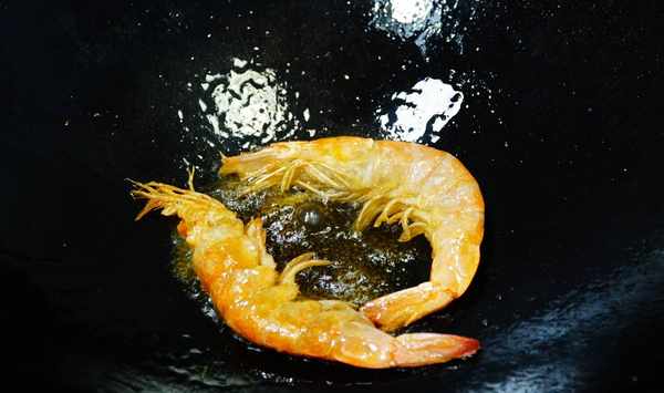第一步:處理食材,食材的處理分為幾步,鍋中稍微多放點油,燒熱以後,放入大蝦煎至兩面金黃後撈出。