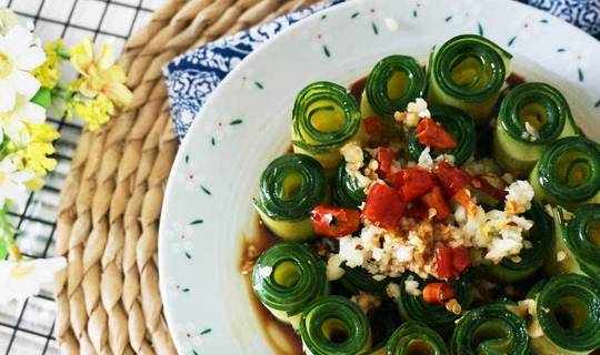 做法:黃瓜洗凈,用刮皮器刮成片狀。卷成卷兒擺盤。蒜薑切末,幹辣椒洗凈剪成小段。調拌汁。碗中加入生抽,鹽,糖,香油,醋調成汁。(具體用量可根據個人口味增減,把握不好的話,用舌頭嘗嘗)將蒜末,薑末,幹辣椒段擺在黃瓜上,鍋中放適量的油,燒熱後,用勺子撒在上面。這時就是響油瞭。