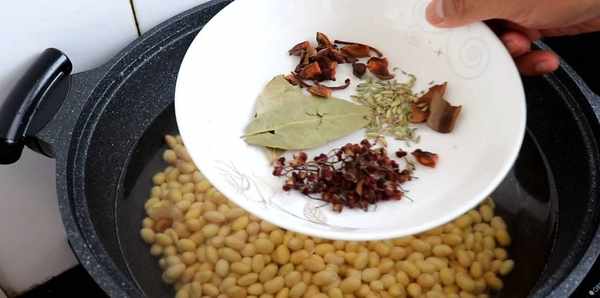 2、下來把黃豆倒鍋裡煮一下,煮的時候加入花椒、八角、桂皮、小茴香、香葉,這裡這些香料裝進調料盒裡面煮,不然最後撈調料的時候不好撈。再加入適量的鹽攪一攪,蓋上鍋蓋煮半個小時左右。