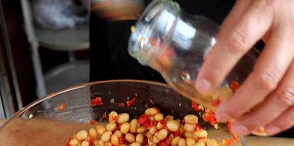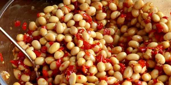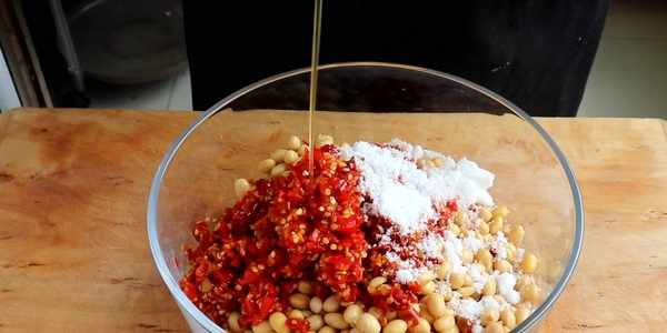 3、黃豆晾幹水份後倒入幹凈的碗裡,往裡面加入自制的剁椒醬。這裡的剁椒醬裡面的鹽比較多,就不用加鹽瞭。黃豆和剁椒醬的比例可以是1:1,吃不瞭辣的,剁椒醬可以少加一些。再加入2勺白糖,加入香油進去,最後再滴幾滴白酒進去攪拌均勻