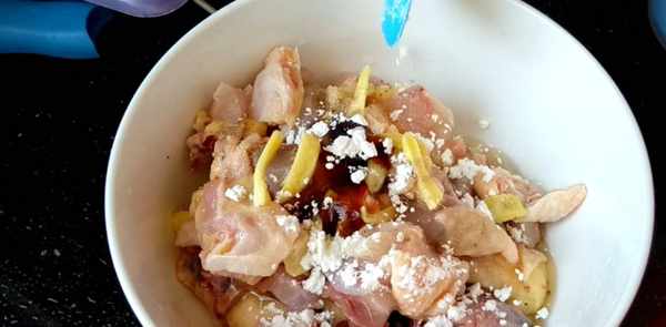 第三步:先來把雞醃制一下,加薑片,鹽,胡椒粉,料酒,蠔油,花生油,淀粉,攪拌均勻,攪拌均勻後醃制15分鐘