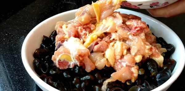 第四步:把石螺放到盤中,把醃制好的雞肉鋪到上面,鋪平就可以瞭,石螺是不放什麼調味料的,醃制雞肉時可以稍微加重點點