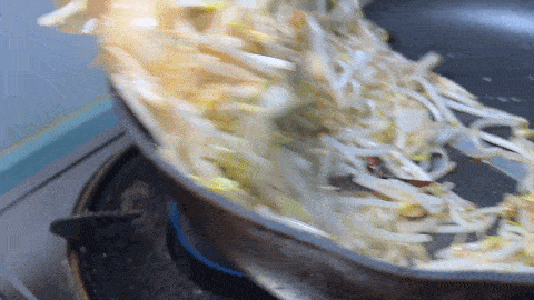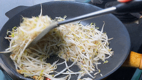 3、 將蒜末和幹紅辣椒爆香,倒入豆芽大火翻炒