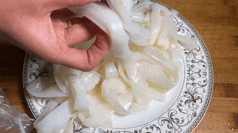2. 將涼皮放入盤中,用手抖散