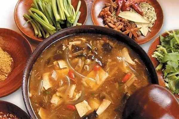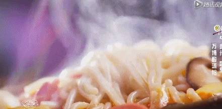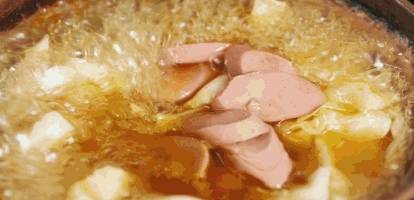 大火煮沸後在砂鍋裡分別加入豬肝、香菇、肉丸子、火腿腸、蓮花白、鵪鶉蛋等配菜。