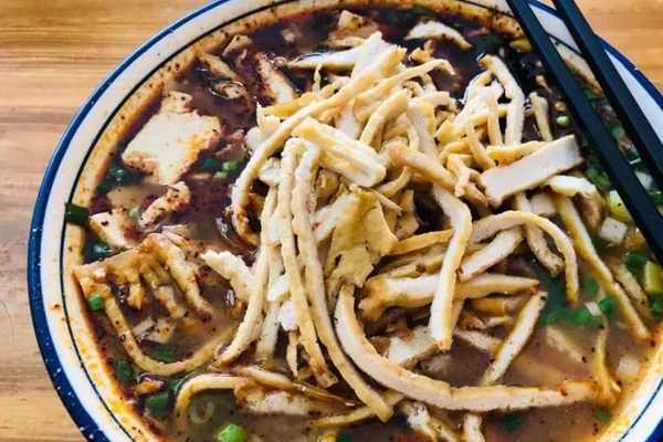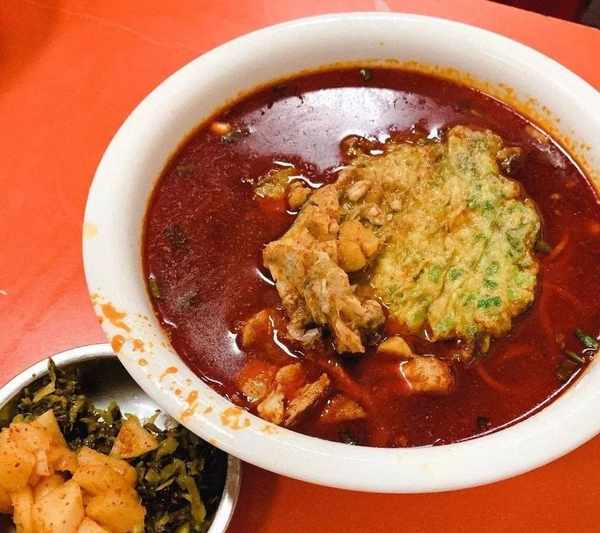 一份用羊後腿骨熬制十幾個小時的大骨湯打底,澆上一勺煨瞭三個小時的後腿肉的肉絲湯面,