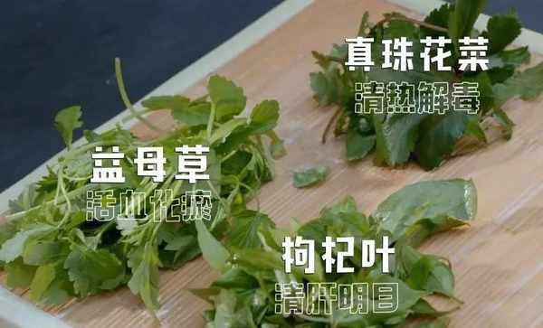 配湯青菜也有講究,有清肝明目的枸杞葉、活血化瘀的益母草、清熱解毒的真珠花菜,
