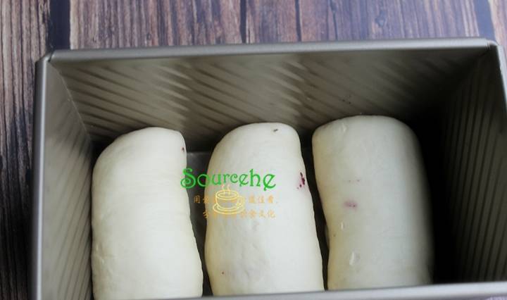 吐司盒放在室溫38度,濕度85%的條件下進行最後一次發酵,發酵到面團到土司盒滿。可以放在烤箱裡,加一盤水,按發酵功能,這過程45分鐘左右。