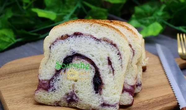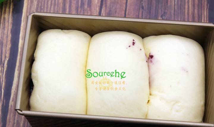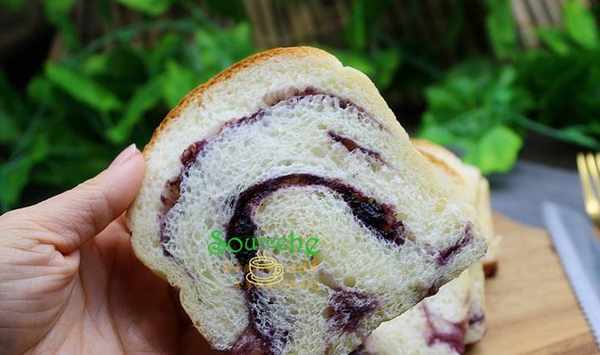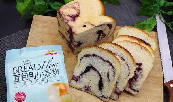 【藍莓果醬吐司】面包食材(450克的土司盒):金龍魚面包用小麥粉270克、牛奶150克、雞蛋20克、黃油25克、白砂糖10克、鹽5克、幹酵母3克、藍莓果醬250克。