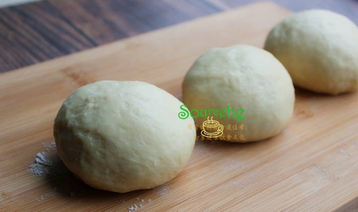 把發酵好的面團,擠出面團內的空氣,分成三等分揉搓成光滑的小團,這個時候的面團光滑柔軟,有彈性,一定要揉至面團內沒有空氣。