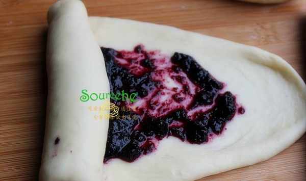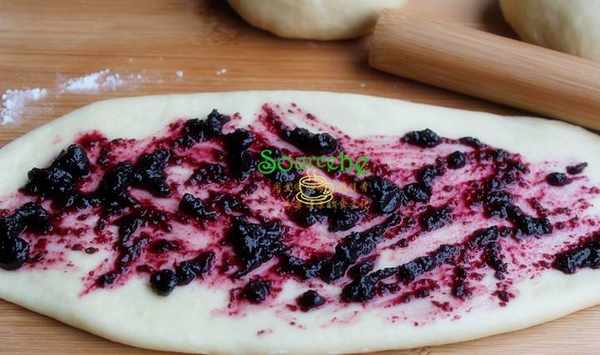 搟開的面團上面均勻塗抹一層藍莓果醬,這種果醬是自己用天然藍莓熬煮的果醬,酸甜可口,零添加,健康又美味,也可以用灌裝的藍莓果醬。