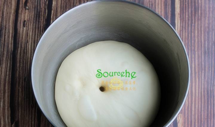 用手把面團揉至光滑,放回廚師機的桶裡,蓋上一塊濕佈,在室溫下發至發酵到2倍大,手指蘸點面粉,按壓面團,不回縮,說明面團發酵好。這個過程夏天一般40分鐘左右即可,冬天發酵時間稍微長些。