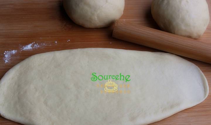 取一個醒發好的小面團,用搟面杖搟成長條狀面皮,寬度要和自己的土司模具寬度一致或稍微小一點,這樣就能放入模具裡。