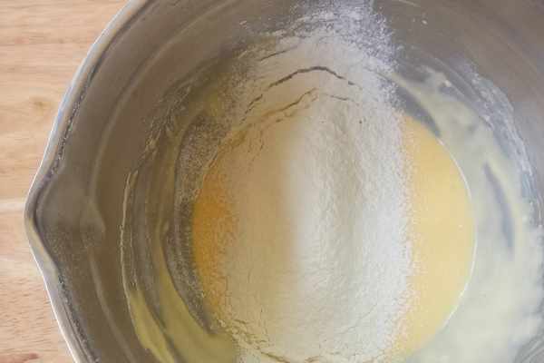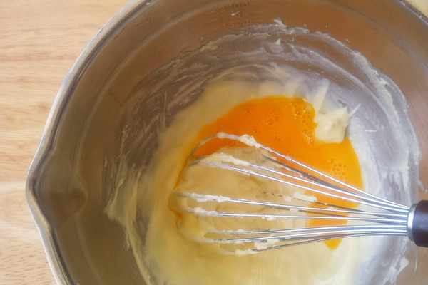 3、再分2次加入雞蛋液,每加入一次,都要徹底攪拌均勻,再加入下一次