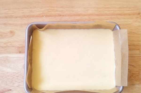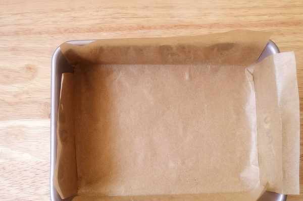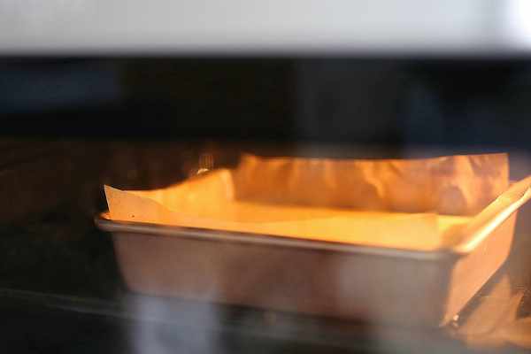 6、準備一個小點的方形模具,墊上油紙防粘。沒有方形模具的話,也可以用戚風蛋糕模來烤,不過要記得墊油紙防粘