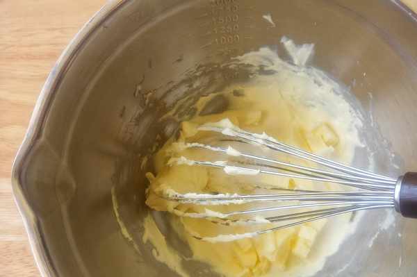 1、將奶油奶酪放在盆子內,隔著熱水,先用刮刀壓軟,再用手動打蛋器,攪打至細膩順滑,然後加入細砂糖和軟化的黃油,繼續攪拌均勻