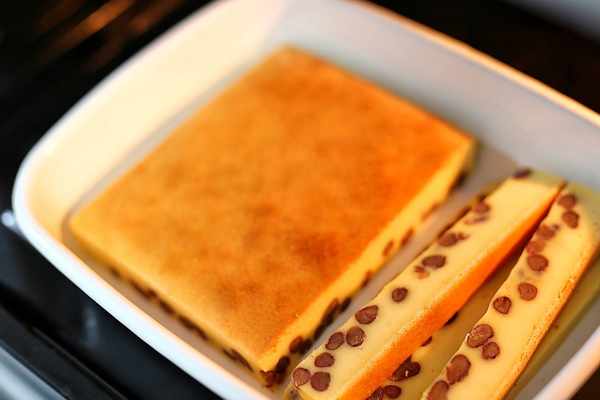 8、把小烤盤放在大烤盤上,大烤盤裡註入一些熱水,送入烤箱中層,上下火180度先烤10分鐘,再轉160度上下火,烤35分鐘。用水浴法烘烤,會讓烤出來的成品更嫩更好吃哦
