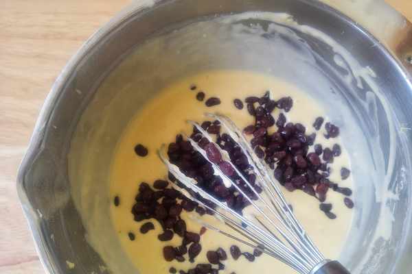 5、加入120克的蜜紅豆,用蛋抽大致攪拌一下即可。不可過度攪拌,容易讓面糊染成紅色