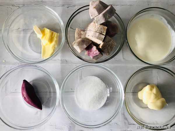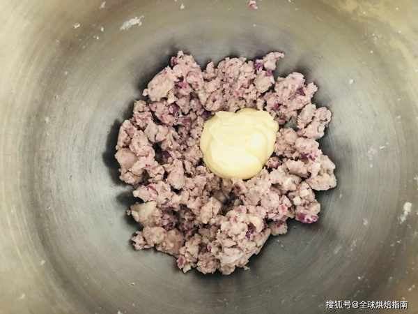 1 /將蒸熟的芋頭和紫薯、砂糖、軟化黃油一起打碎。