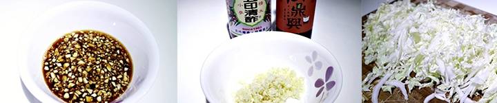 2、加瞭醋後,醬油也要一並倒入;媽媽說若醬油直接倒入白菜會咸淡不均,所以一定要一起調在碗裡。先嘗一下咸淡,因為會加入水分含量高的大白菜,可以偏咸一些。在泡大蒜時,就可以利用時間燙一把粉絲,撈起後放涼再切成段。接著就取適量的大白菜葉切成細條狀。不能太寬不然吃起來口感會粗,也不能太細,沒有口感也很讓人傷心,大概0.3cm最佳;