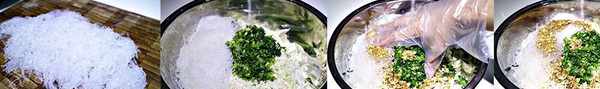 3、接著把切絲大白菜、粉絲、香菜放進一隻大盆;接著倒入調味醬,用手攪和均勻。是說手真的比筷子湯匙好用很多呢;