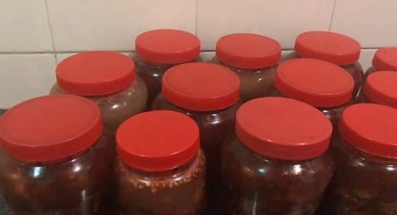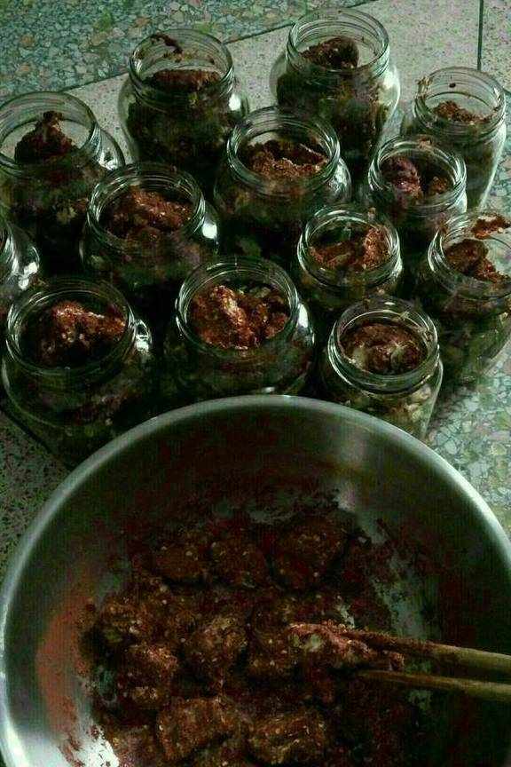 繼續把裹滿鹽醃配料的豆腐乳挾進瓶裡。