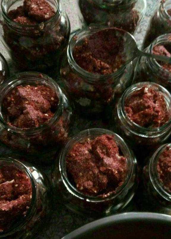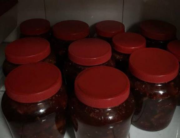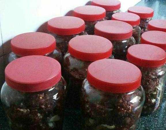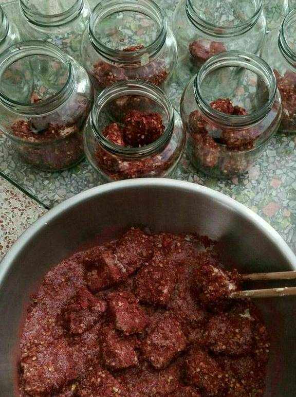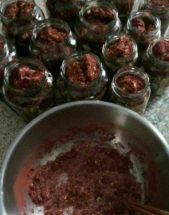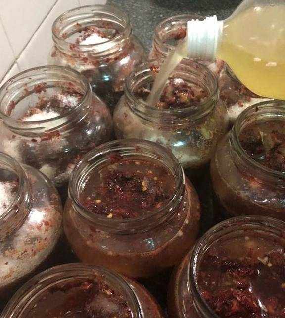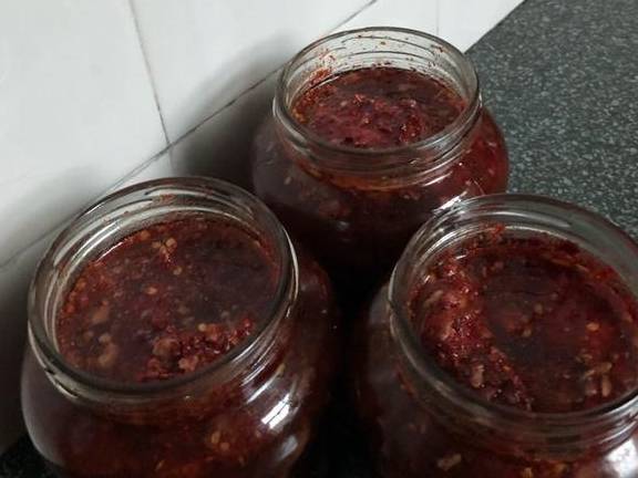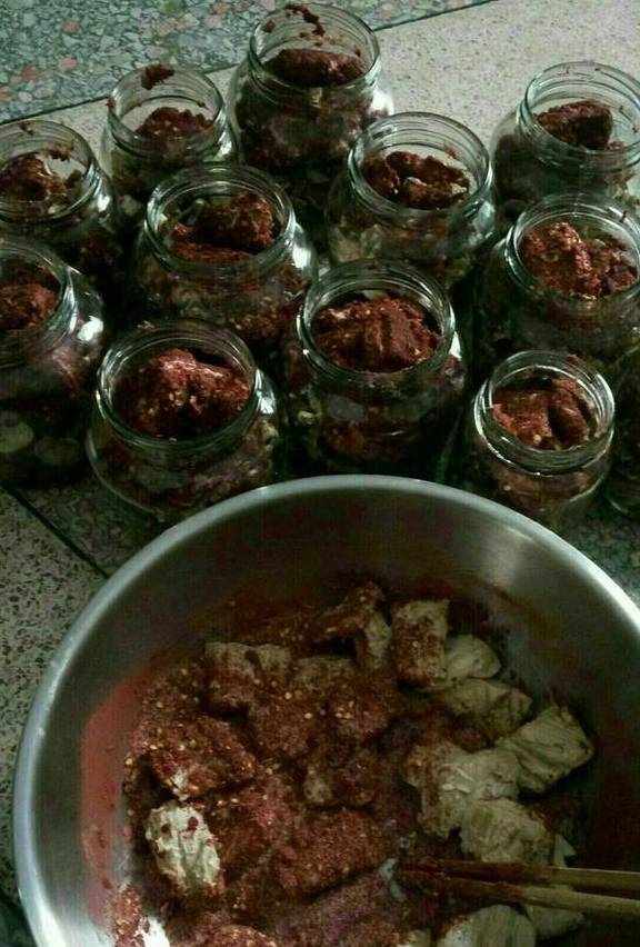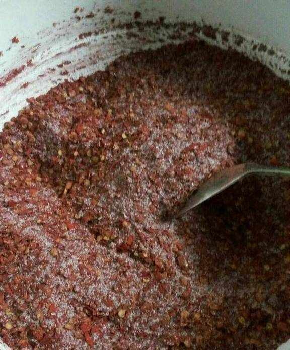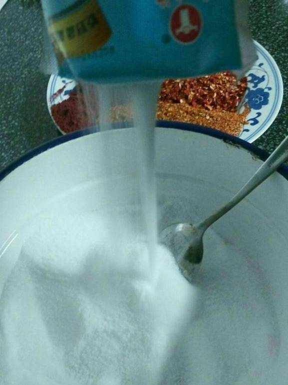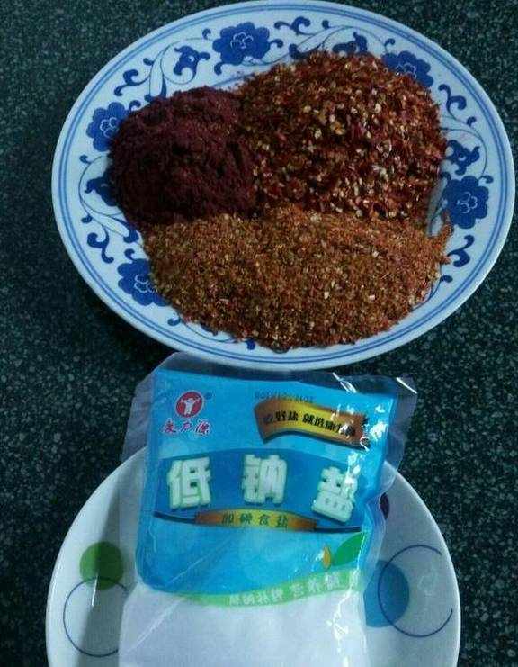 3包加碘鹽、食用曲粉1兩、辣椒末4兩(小辣椒末1兩、不辣的辣椒末3兩、根據自己的口味調整)。