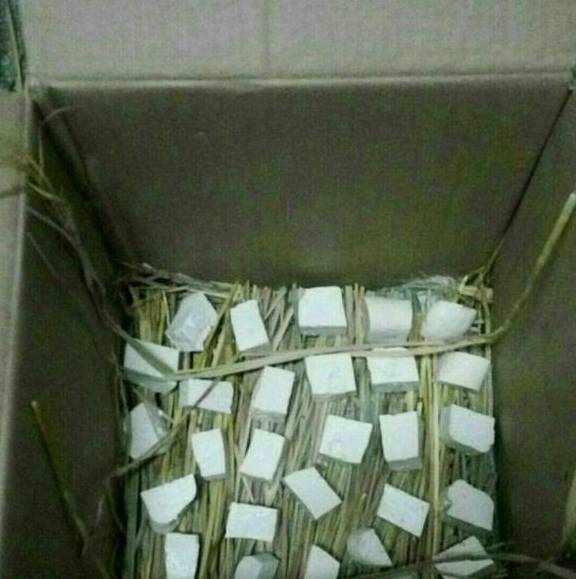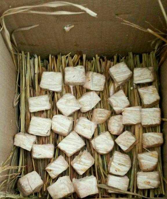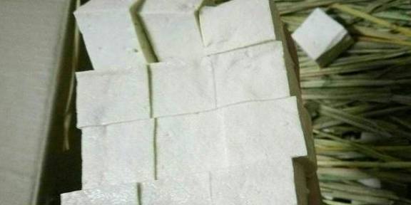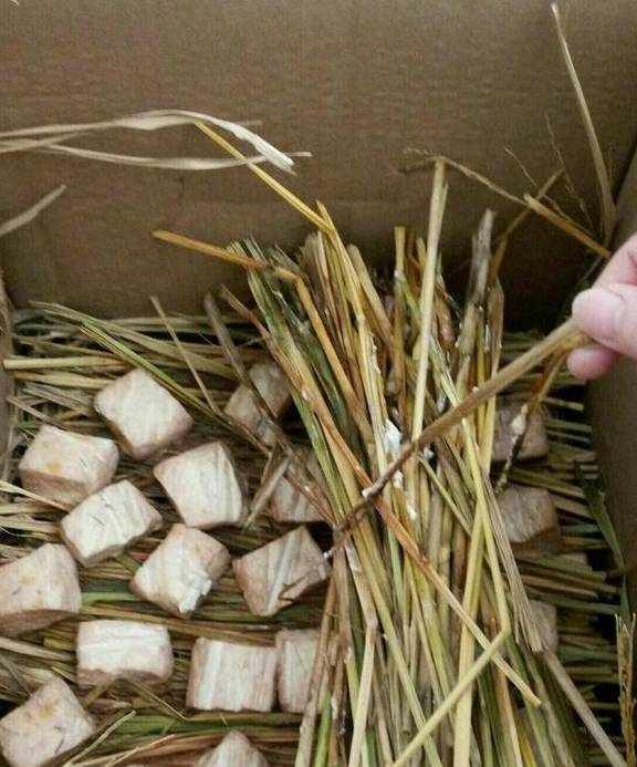 將豆腐擺放在稻草上面,它們之間留一定間隔,整齊排列好,然後把兩根稻草橫在豆腐面上,拉開點距離,以便於以後稻草整層拉起。