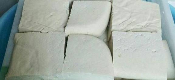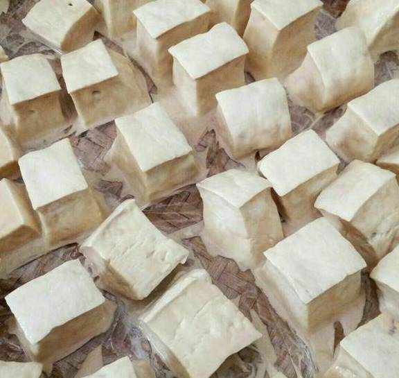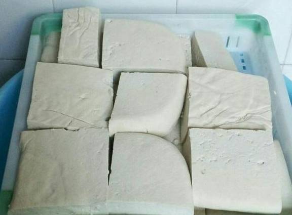 選用厚的鹵水豆腐一板(鹵水豆腐比石膏豆腐堅實,硬度、彈性、韌性均比石膏豆腐強,含水份比石膏豆腐低,口味比石膏豆腐香),靜放二天,瀝幹水分。