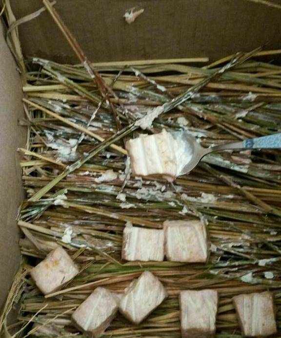 大約九天左右,長好毛黴的豆腐乳可以裝瓶瞭。將面上的稻草撤除。(將原先設定放置的兩根稻草拉起,整層稻草就可掀開)