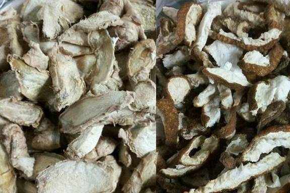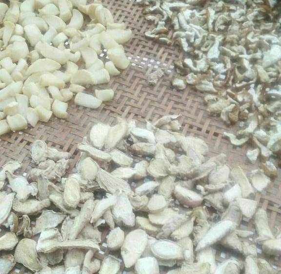 已曬幹的柚子皮、蘿卜粒、薑片放置備用。