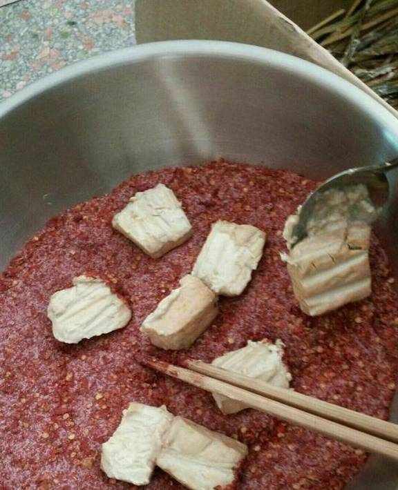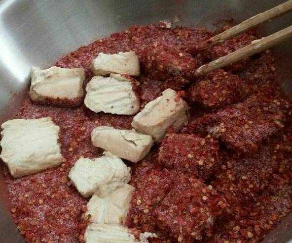 用小湯勺將長好毛黴的豆腐乳輕輕地一塊一塊移到事先準備好的鹽醃配料盆裡。