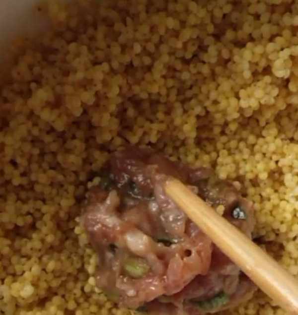 把攪拌好的山藥肉末挖成丸子的形狀,再準備小米,清洗幹凈,把山藥肉末泥裹上一層小米。