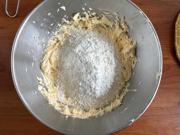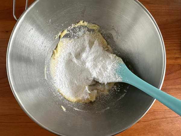 1、黃油提前軟化,用刮刀能輕松按壓的動就可以,篩入糖粉和鹽翻拌均勻;