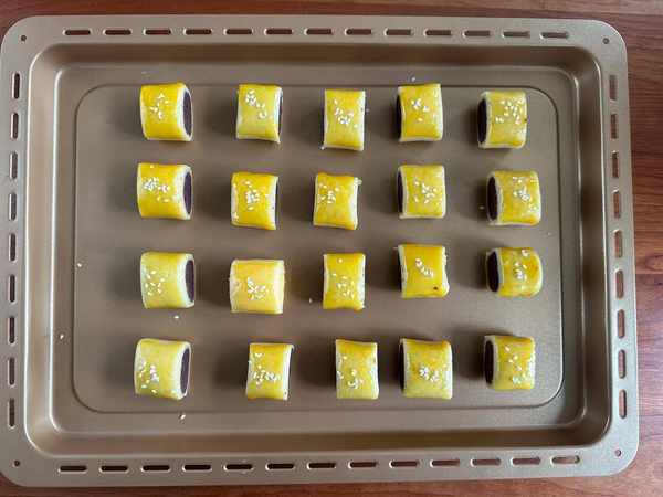 6、擺放在烤盤上,表面刷上蛋黃液,撒上白芝麻;