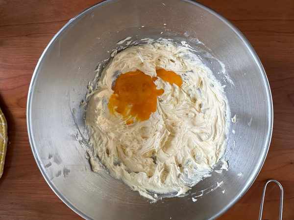 2、電動打蛋器打均勻,然後分次加入蛋液打均勻,每加一次都要徹底攪打均勻再加下一次。直到黃油把蛋液完全吸收瞭。