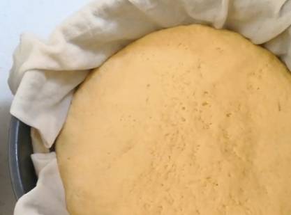 在模具裡墊上濕的籠佈.把揉好的面團放進去.摁平