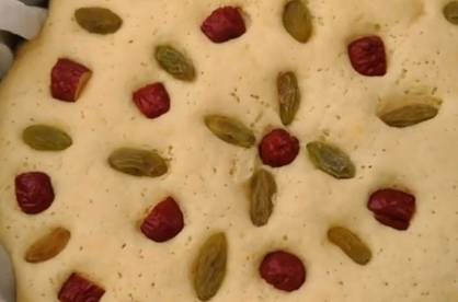 放在溫暖的地方,發酵到2倍大.發好以後,在上面擺上紅棗和葡萄幹.