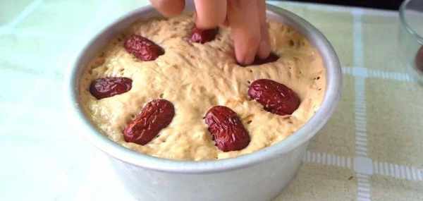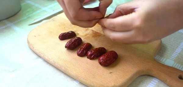 準備紅棗適量,對半切開以後把紅棗核去掉,面糊發酵到兩倍大。