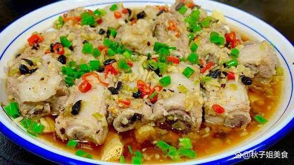 2、將腐竹平鋪在盤中墊底,排骨擺在上面,最後將豆豉和大蒜均勻的撒在上面。水開後大火蒸15分鐘左右。蒸熟撒上小蔥花就可以啦。