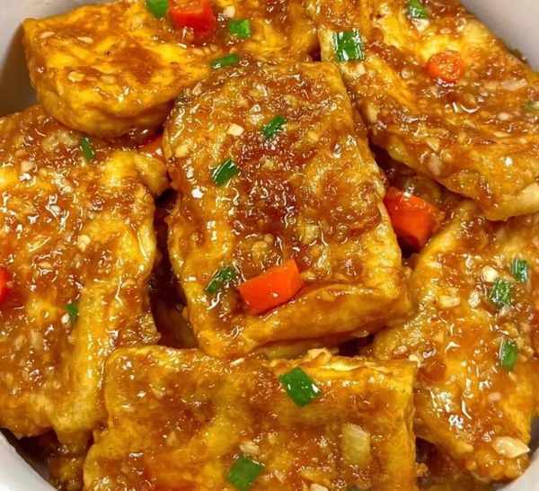 4. 重新起鍋倒油,熱油爆香蒜末,再放入煎好的豆腐,倒入調好的醬汁翻炒幾下,最後放小米辣和小蔥,炒勻收汁即可。
