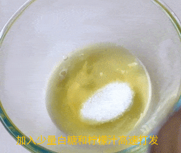 蛋清中加入6g白糖和少許檸檬汁高速打發,打發至攪拌器上掛有小彎勾即可,白糖分量可依據口味自行調整。