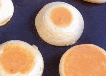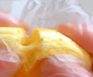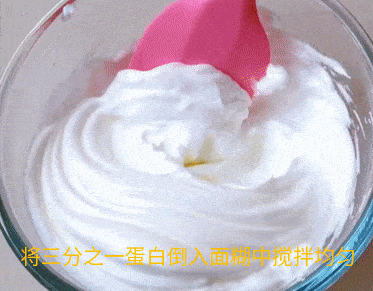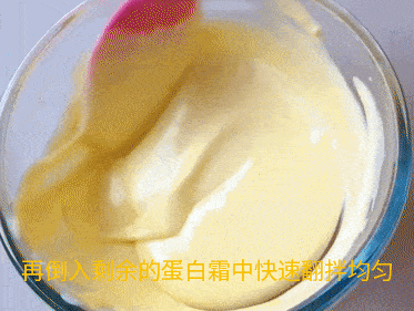 取三分之一蛋白霜到蛋黃糊中翻拌均勻,再倒入剩餘的蛋白霜中快速翻拌均勻。註意攪拌的時候輕一點,不要把蛋白中霜中的氣泡擠出。