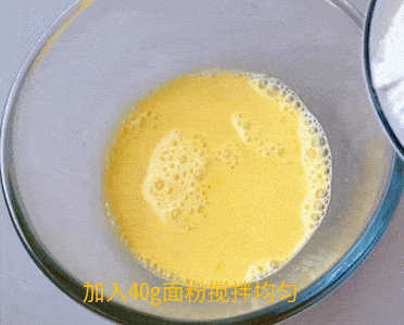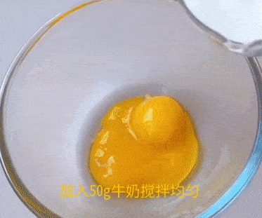 蛋黃中加入50g牛奶和40g低筋面粉攪拌均勻。