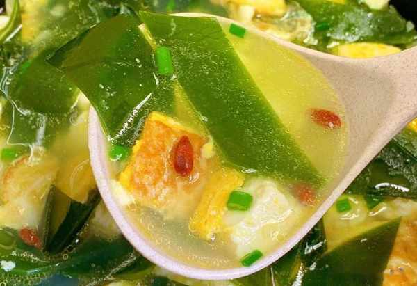 2、油熱放蒜末炒香,加入雞蛋,加入適量的開水,放嫩豆腐煮3分鐘,放海帶煮2分鐘,加入適量的鹽,枸杞,蔥花即可出鍋。
