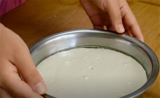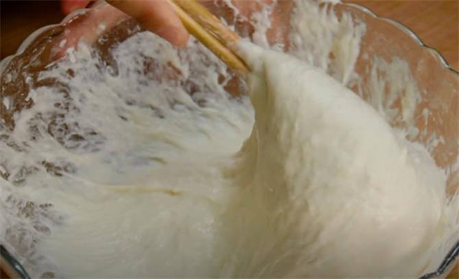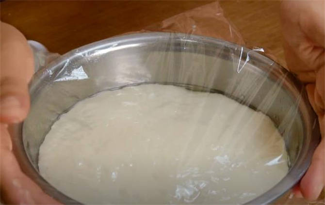 2.準備一個幹燥幹凈的容器,刷層油防粘,倒入面糊,蓋上保鮮膜發酵到1.5倍大。