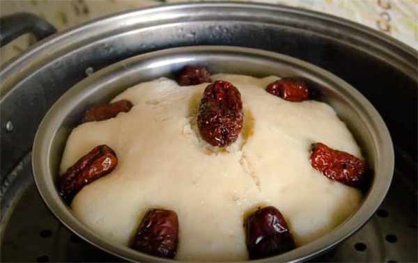 4.我在上面又放瞭幾顆大紅棗增加棗香味,放好之後涼水上鍋,大火燒開後轉中火蒸40分鐘,燜5分鐘就可以瞭。